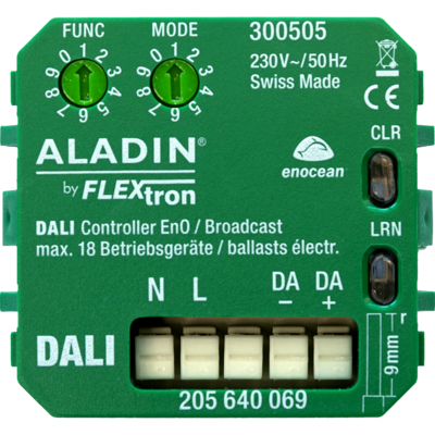 Broadcast DALI Controller für bis zu 18 DALI-Betriebsgeräte. Ansteuerung via Funktaster, Handsender oder Smartphone möglich.