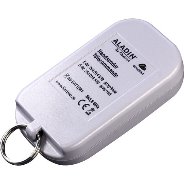 Kleiner, ergonomischer Handsender als mobile Fernbedienung konzipiert. Der Sender kann für alle ALADIN Empfänger verwendet werden. Zum mobilen Schalten und Dimmen von Beleuchtung. Zum Steuern von Jalousie (mit Verstellen der Lamellen), Rollladen und Markisen. Zum Öffnen/Schliessen von Garagentoren und Einschalten der individuellen Empfangsbeleuchtung. Funktioniert wartungsfrei und ohne Batterie. Verschiedenste Funktionen können am Empfänger eingestellt werden. Rückseitig kann ein Ring befestigt werden, um z.B. ein Trageband anzubringen. Farben: Gehäusefarbe hellgrau, Tastenfarbe blau.