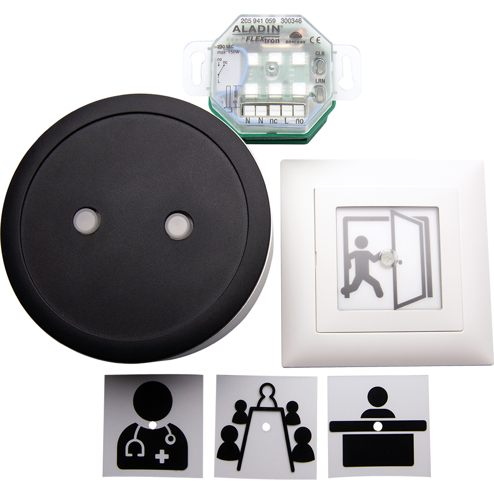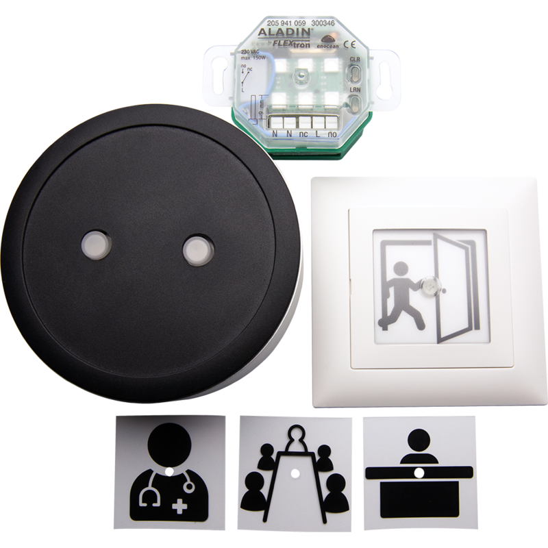 Vom Pultsender mit Statusanzeige (Tasten rot/grün) aus wird ein Schaltbefehl an die Eintrittsampel gesendet. Die Eintrittsampel schaltet rot oder grün. Am Pultsender kann der Status abgefragt werden. Dies eignet sich insbesondere für Büros, Wartezimmer, Arztpraxen etc. Das Set kann optional mit der Funkklingel ALADIN Bell (300468) erweitert werden. Eintrittsampel mit 4 Pictogrammen