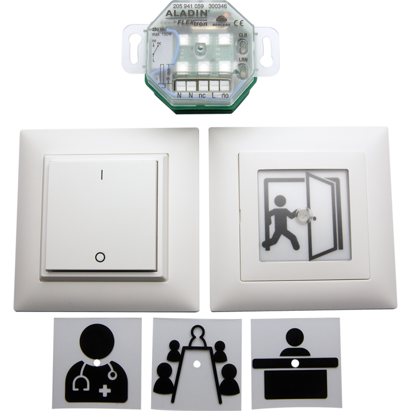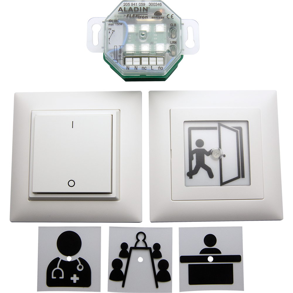 Das Set kann optional mit der Funkklingel ALADIN Bell (300468) erweitert werden. Der Ampel-Empfänger wird mit 4 verschiedenen Piktogrammen geliefert.