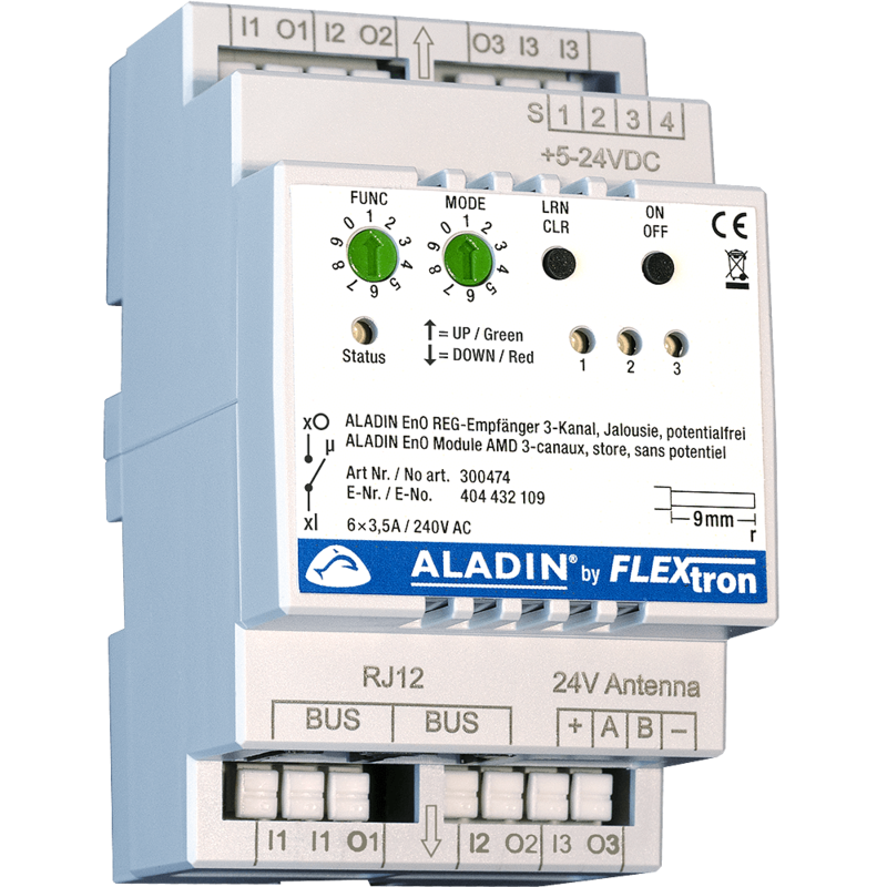 Reiheneinbaugerät-Schaltmodul (3TE), 3-Kanal, ohne Spannungsversorgung für den internen BUS. Zum Steuern von Jalousie, Rollladen, Markisen und anderen elektrischen Verbrauchern. Der Empfänger kann mit div. ALADIN-Sendern individuell gesteuert und mit unterschiedlichen Funktionen und Parametern (bis 45 unterschiedliche Einstellungen) belegt werden. Es können dem Empfänger mehrere Sender (auch mit unterschiedlichen Funktionen) zugeordnet werden. Das Einlernen erfolgt auf einfache Weise über professionelle Drehschalter und Tasten. Bis 128 unterschiedliche REG-Module, oder Antennen-Module können auf einfache Weise via Modul-BUS (RJ12 Stecker) kombiniert werden. Sichere Funkverbindung auch in grossen Gebäuden, da beliebig viele Antennen-Module in Serie via Antennen-BUS (G51-Kabel) auf das REG-System geführt werden können. 3 potentialfreie Relaisausgänge sind unabhängig voneinander einstellbar. So können bis zu 3 verschiedene Jalousien, Rollladen oder Markisen mit einem Gerät individuell gesteuert werden. Der Empfänger kann auch von Sendern mit neuester Secure-Verschlüsselung angesteuert werden.