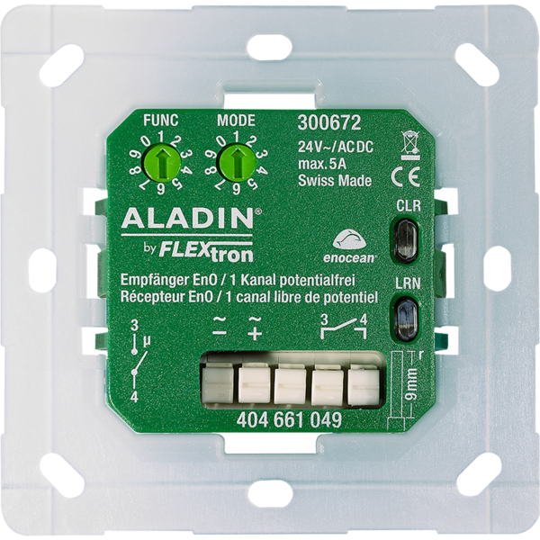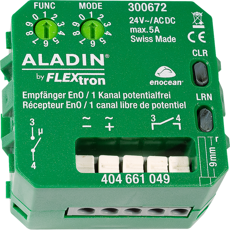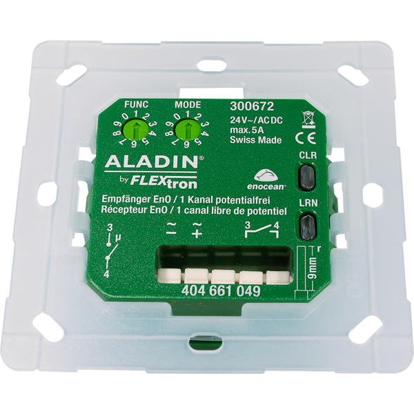 1-Kanal Funk-Empfänger (potentialfrei) zur Ansteuerung von Türen, Toren, Fenstern, Beleuchtung und anderen Kleinspannungsanlagen. Der Empfänger kann mit div. ALADIN-Sendern individuell gesteuert und mit unterschiedlichen Funktionen und Parametern (bis 90 unterschiedliche Einstellungen) belegt werden. Es können dabei auf dem gleichen Kanal mehrere Sender auch mit unterschiedlichen Funktionen abgespeichert werden. Das Einlernen erfolgt auf einfache Weise über professionelle Drehschalter und Tasten. Der Empfänger verfügt über Repeater-Funktion und über Statusanzeige der aktiven Ausgänge. Der Empfänger kann auch von Sendern mit neuester Secure-Verschlüsselung angesteuert werden. Zum optimalen Funkempfang bei UP-Montage (1x1) verfügt der Empfänger über ein von Flextron neu entwickeltes Montagesystem. Oekologisch hergestelltes Gehäuse, aus 92% rezykliertem Kunststoff. Herstellung in der Schweiz / Swiss Made